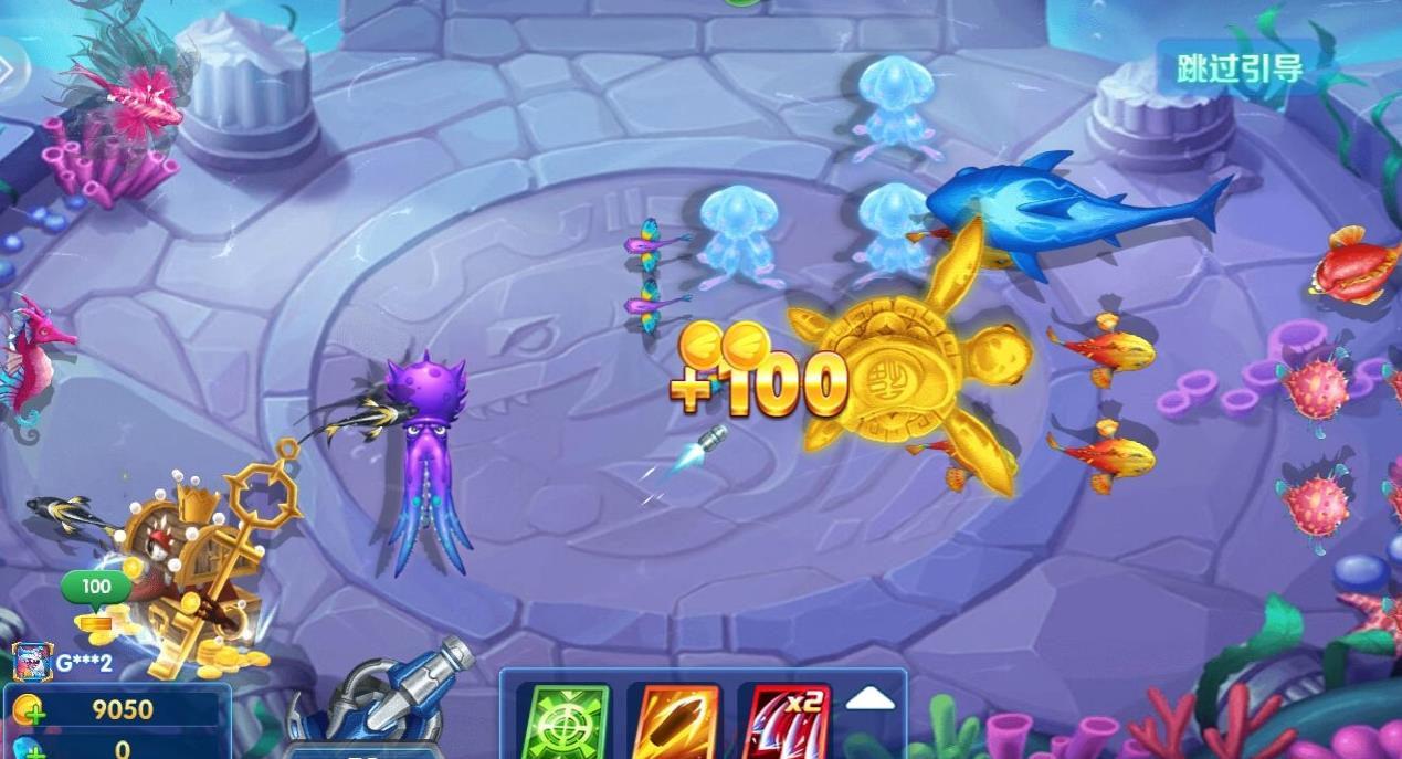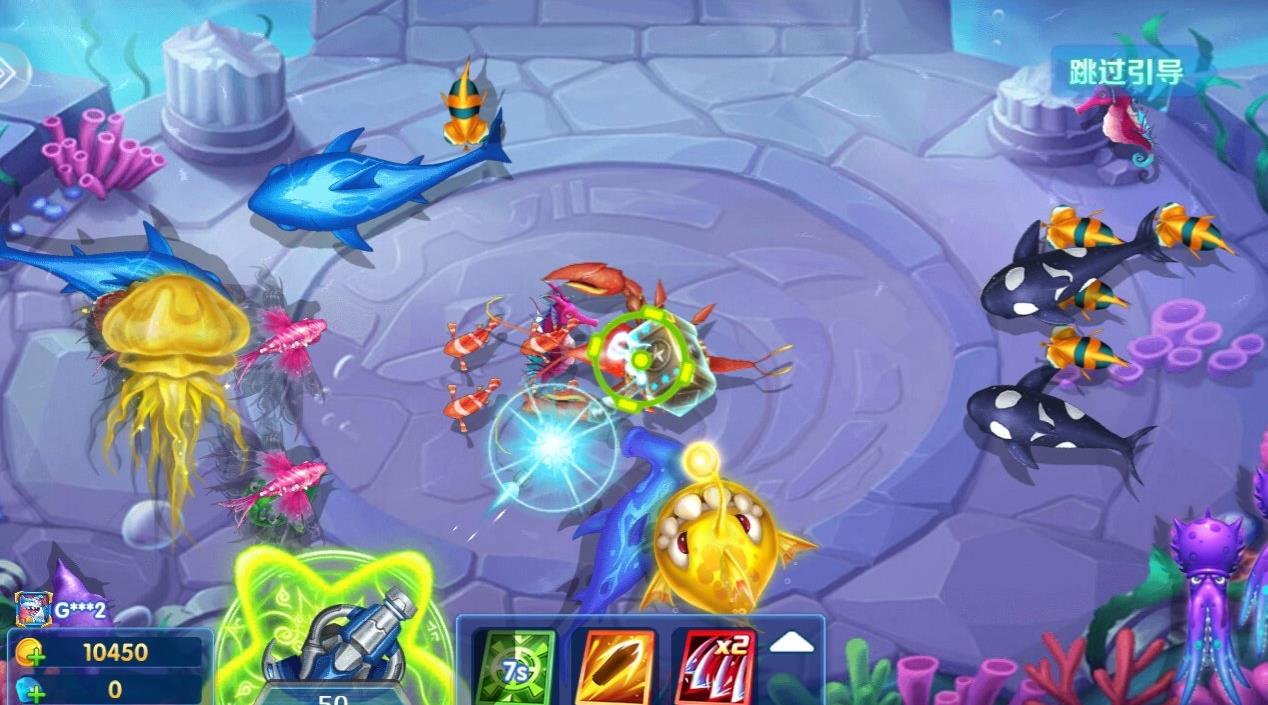 游戏每隔一段时间,在屏幕右边就会出现技能攻击的标志,你只要点击,就可攻击屏幕中的鱼。不过,技能的攻击不要无节制的乱用,而是针对高分鱼种的所在位置使用。金鲨优先其次是蓝鲨、魔鬼鱼等生物。