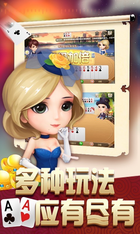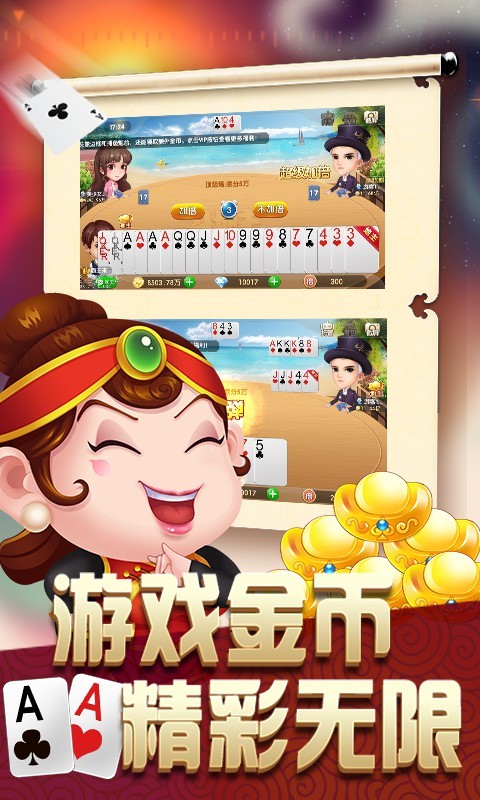游戏福利丰富:新手礼,破产补助,每日签到领金币,牌局任务领金币;