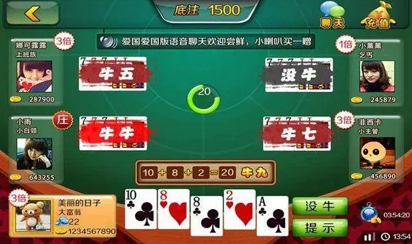 2. 第二组的两个牌要进行大小比较,要求这两个牌要进行加法运算,10的整数倍是最大的,1是最小的。如果第二个数字等于10或20,我们就将其称为“牛牛”,其他情况下的个位数将决定牌型的名称,如牛一、牛二等。