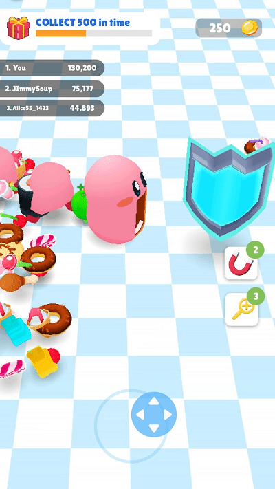 1、基础吞噬模式:滑动控制移动方向,自动吞噬路径上的食物。头部越大,能吃的食物种类越多。