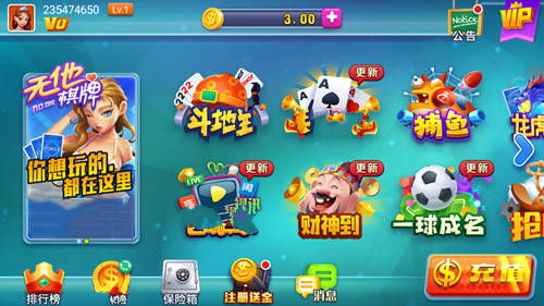 1. 斗地主:包含了多款斗地主游戏,玩家可以自由选择参与。斗地主作为现代人休闲娱乐的主流方式之一,在棋牌中得到了完美的呈现。